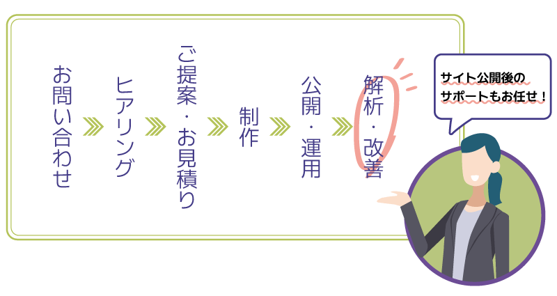 OPTIONサービスをお申し込みのお客様には、アクセス解析・サイト分析をもとに改善(PDCA)し、ゴールを目指します。 リスティング広告やSNS広告もお任せください。